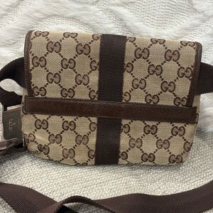This vintage Gucci belt bag is in good preloved condition, please see photos. The bag shows signs of wear throughout, mainly in discoloration/marks to exterior canvas/corners, leather, trim, and hardware. No major flaws that affect functionality. In my opinion, the flaws on this bag are not noticeable. Approximately 7” w, 5”h, 2.5”d, 32”adjustable strap/belt total length max. Such a cutie!