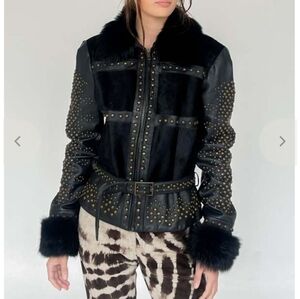 Stylish black leather jacket with studded details. Features faux fur collar and cuffs. Perfect for a bold look.
