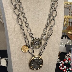 NWOT, Never Worn! Vintage Chico's necklace with layered silver chains and gold accents. Features multiple pendants for a bold look. The mix of metals and coin embellishments create the perfect piece for stacking, layering and maximalist lovers. Perfect for any occasion.
