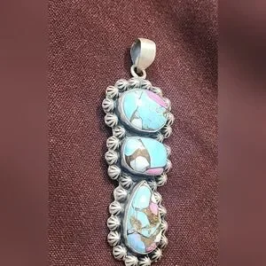 This exquisite artisan Pendant features a stunning combination of turquoise and pink stones ( cotton candy)set in a beautifully crafted sterling pendant.i do Not have a necklace, just the pendant. Perfect for adding a touch of elegance to any ensemble.