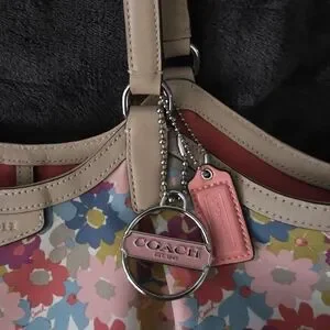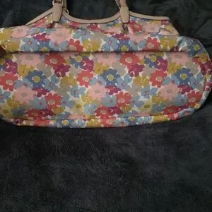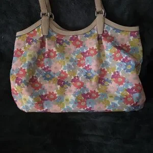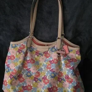 The COACH Peyton Floral Print Multicolor Canvas Satchel Tote Shoulder Bag - F28931 is a large rectangular shoulder bag with a multicolor floral print design. It features double beige handles, a clasp closure, and silver hardware accents. The bag includes an interior zip pocket and a bag charm accessory, making it ideal for casual occasions. The exterior material is a mix of canvas and leather, with a pink lining. The Coach Peyton satchel tote shoulder bag is part of the Coach Flowers collection and is designed for women who appreciate a stylish and functional handbag. Bag is FLAWLESS condition with no stains or wear on the canvas. Leather handles are PRESTINE, as seen in images. Bag comes with classic Coach handtag and pink Coach charm. Very cute tote, feel free to ask any questions! HIGHLY COLLECTABLE.