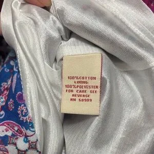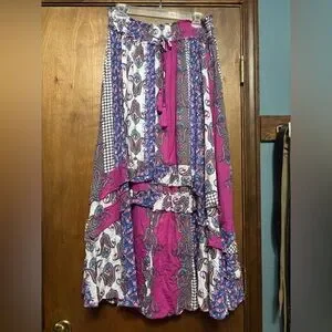 100% Cotton Vibrant Patchwork Style Skirt Lining is polyester to knee. Smocked waist with tie and tassels and high low ruffle design around skirt. Like new item.