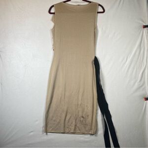 Valentino Made In Italy Beige Sleeveless Bodycon Dress W/Ruffle Details Size M. Excellent pre-owned condition. Textured design. Attached black belt. No lining. 94% viscose 6% polyester. Measures approximately chest 30", length 40", waist side to side 13".