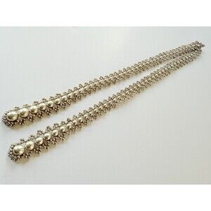 Very chic, and very intricate, vintage French faux pearl lariat necklace from the art deco era. Lampwork glass pearls hand-strung in a crochet-like pattern that graduates in size. Champagne-like color with a beautiful pearly sheen. I believe both the pearls themselves as well as the design are by Louis Rousselet - a fabulous French parurier who created jewelry for a number of the French couture houses. Rousselet created a piece Ive had in the past that was nearly identical except it had two central rows of pearls, rather than one. Though its more common now for lariat necklaces to be worn towards the front, I especially love this piece worn more akin to some of the original flapper styles, to the side, or across the front of the neck with the open ends trailing down the back - but it can be worn in a number of ways. About 27.5 end to end.