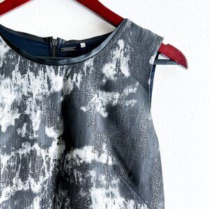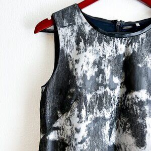 This sophisticated Elie Tahari sleeveless sheath dress features a bold black and white abstract print with rich texture and luxurious leather details. Crafted with premium materials, the dress is trimmed with genuine lamb leather at both the neckline and the hem, giving it a sleek and elevated finish. The textured woven fabric creates a structured and flattering silhouette, while the smooth lining ensures comfort.
