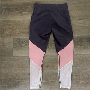 Stylish Fabletics leggings. Black with pink and cream accents. Perfect for workouts.