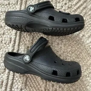 Durable black clogs with playful charms. Easy to slip on. Ideal for active kids.
