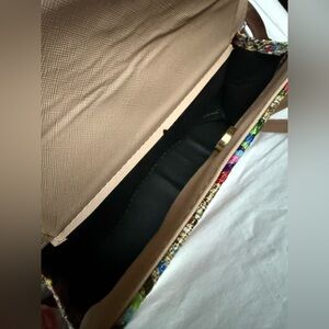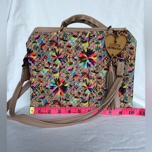 Artisanal Wood and Leather Colorful Mosaic Needlepoint Crossbody Purse. Structured handbag featuring a colorful embroidered needlepoint floral pattern on a neutral-toned background. Light tan handles and a detachable shoulder strap. A wooden heart-shaped charm with the text "I LOVE ARTESANAL" and a matching tassel dangle from one of the handles. The embroidery displays a vibrant array of colors, creating a lively and artisanal aesthetic. Pockets and zipper on the interior.
