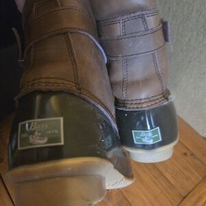 Stay warm and dry with these Bass Brown leather trimmed Duck Boots. Perfect for outdoor adventures, these boots offer durability and comfort. excellent condition. size 10