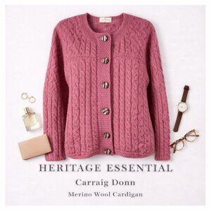 Preppy Meets Heritage: Irish-made wool combined with a timeless silhouette. Channel polished, old-money prep with this Carraig Donn 100% merino wool cardigan in a standout pink cable knit. Made in Ireland with exceptional craftsmanship, this sweater blends traditional structure with a bright, modern color that elevates any smart-casual wardrobe. A perfect layering piece for work, weekend, or après-ski elegance.