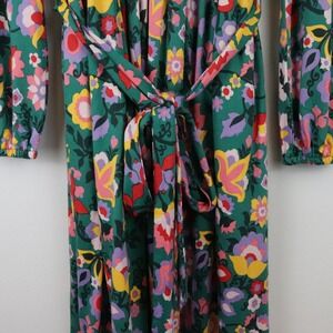 Boden Willow Tiered Jersey Dress in a vibrant green with a multi-colored floral print. This charming dress features a flattering V-neckline with a ruffled collar, long sleeves with button cuffs, and a cinched waist with a matching fabric belt. The tiered skirt adds a lovely flow and movement, making it perfect for a garden party or a casual brunch.