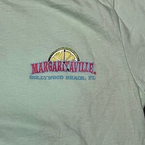 Light green Margaritaville t-shirt with colorful graphic design. Features vibrant red, blue, and green accents.