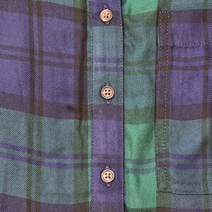 Casual button-down shirt with a plaid design. Features green and blue tones. Ideal for everyday wear.