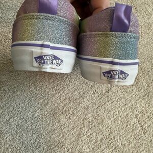 The product is a pair of Vans Rainbow Glitter Asher Pull-Ons in youth size 6 or women's size 7. These athletic shoes feature an ombré pattern, slip-on closure, and multicolor design. The style is a slip-on, making them easy to put on and take off. The Vans Ombré model offers both comfort and style for girls who love colorful and trendy footwear.