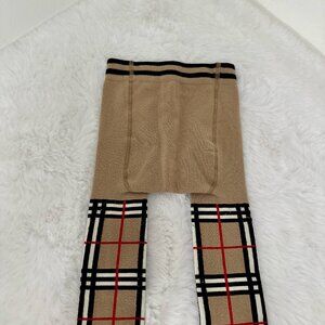Adorable girls’ tights featuring a classic beige plaid pattern with black, white, and red accents—reminiscent of a timeless designer look. Soft, stretchy, and comfortable, with a solid tan upper and a striped elastic waistband for a secure fit. Perfect for pairing with dresses, skirts, or fall outfits.