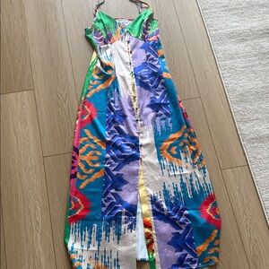 Vibrant maxi dress featuring a strappy design. Multicolor pattern with green, purple, blue, orange, and yellow hues.