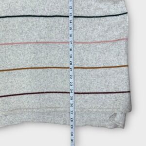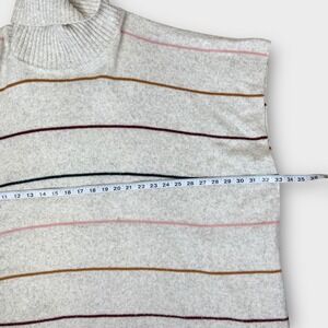 Stylish cowl neck poncho sweater by LOFT, perfect for layering. This charming piece features a relaxed, draped silhouette, providing both comfort and a fashionable edge. The cream-colored knit is accented with horizontal stripes in shades of brown, burgundy, pink, and green, adding visual interest. The poncho has a cozy cowl neckline and short sleeves that enhance its laid-back appeal. This sweater cape is ideal for casual outings, weekend brunches, or cozy evenings at home.