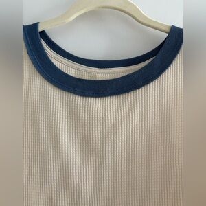 Free People waffle fabric Jayson thermal top with a cream body and blue neckline. Casual and comfortable style. Long sleeves, like new, smoke free home, size Small.