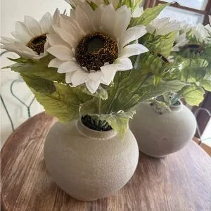 Brighten your space with this chic tan vase featuring a lively sunflower display. A perfect accent for any room.