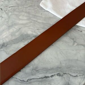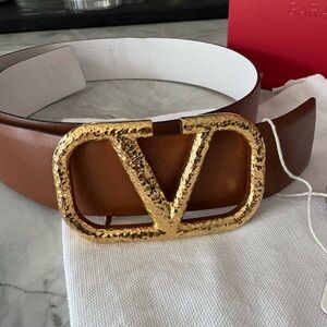 Chic Valentino belt in tan/white reversible leather. Features a bold gold hammered logo buckle. Perfect for a stylish touch. 2.8 inches wide, size 75