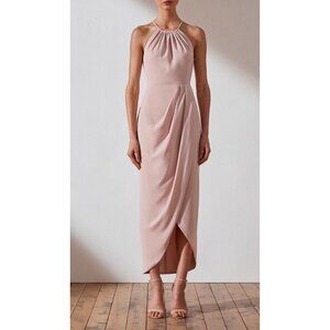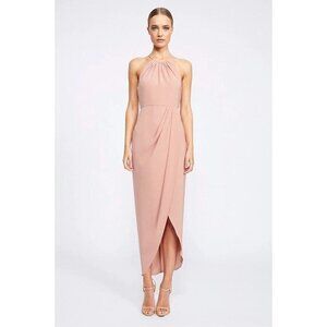 The Core High-Neck Ruched Dress by Shona Joy features a stunning halter-neck design and a gathered waist. The draped skirt falls to flatter the silhouette.