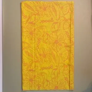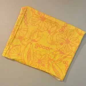 Bright yellow cloth with orange floral and fruit patterns. Features the Goodr logo.