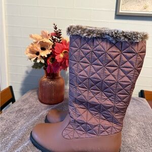 Stylish brown quilted boots. Cozy fur trim. Ideal for winter wear.