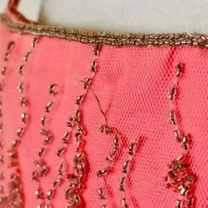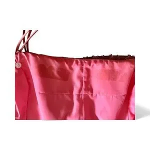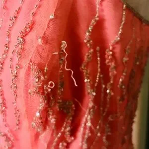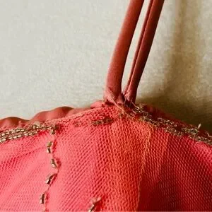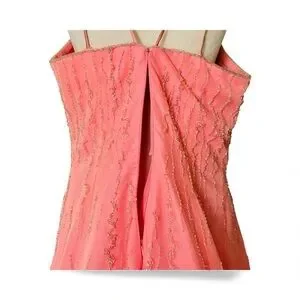 Galinda herself would be wondered by this elegant coral pink prom dress by Alfred Angelo. Features delicate gauzy overlay and silver beaded bodice detailing with spaghetti straps and full flowing figure flattering a line skirt.