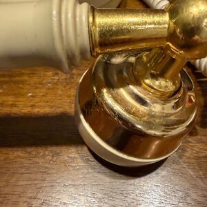 * MATERIALS: CREAM/IVORY PLASTIC BODY WITH PROMINENT GOLD-TONE METAL ACCENTS ON THE CRADLE AND EARPIECES.