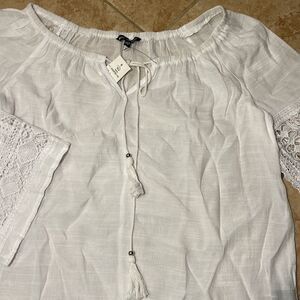 White rayon/polyester blend shirt with lace sleeve accent NWT size S