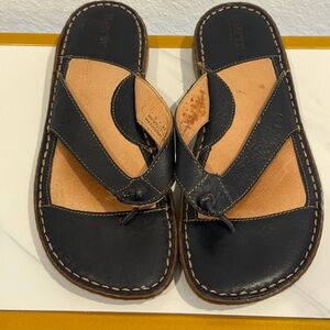Experience elegance with Born leather sandals. Sleek black straps and tan footbed. Ideal for everyday wear. It’s got a flaw on the inner lining but overall in great condition.