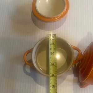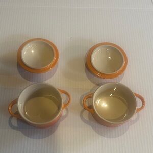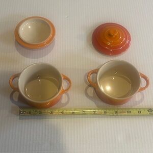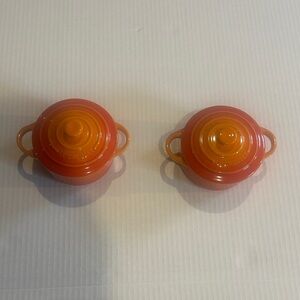 NWOT Pair of Le Creuset mini cocottes. Bright orange hue. Ideal for single servings. I washed them but never used them