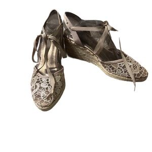 Step out in style with these elegant lace wedge espadrilles. Perfect for any occasion, these shoes feature a beautiful lace design and a comfortable wedge heel. The neutral tones make them versatile for any outfit.
