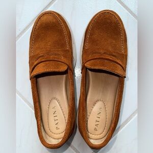 These loafers by Patina are perfect for casual wear. These can be dressed up or down depending on the occasion. They feature a suede like fabric exterior and rubber chunky sole. They have an easy slip on design. These have been worn once for church. EUC. Selling as is no box included.