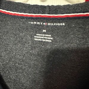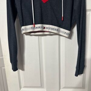 Stay stylish with this Tommy Hilfiger cropped hoodie. Featuring a striking navy, red and white design, it's perfect for casual outings. V neckline with grommet drawstring hoodie. Brand name waistband. Cotton/Polyester material. Size medium. Enjoy the comfort and iconic style of Tommy Hilfiger.