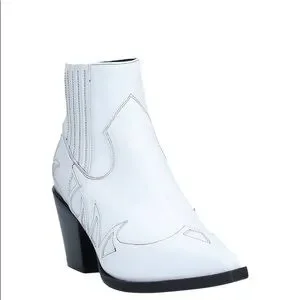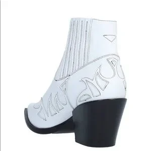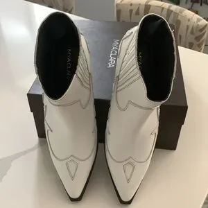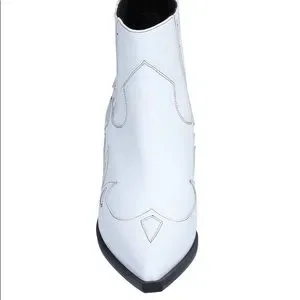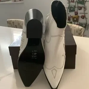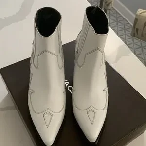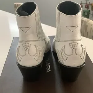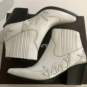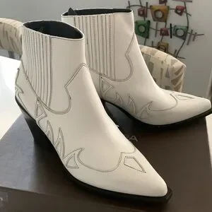New in box. Boho Leather ankle boots with western pattern. Soft leather. Leather lining. Leather sole. Narrow toe line, pointy. Heel is approximately 2.73” high. Color is white. It doesn’t have zipper closing. There are elastics on top for easier in and out. The size is an European 38 . I am a 7 and I would say that they fit 7 7 1/2 Stay tune for measurements later today. Feel free to ask any questions.