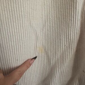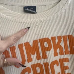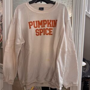 Cozy cream sweater with 'Pumpkin Spice' in bold orange letters. Perfect for fall, runs oversized. Note that sweater has a few pills and a stain as shown