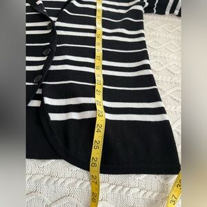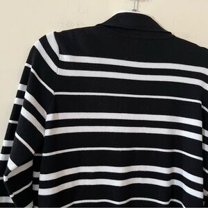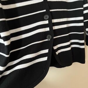 EUC excellent condition & quality! Stylish black and white striped cardigan with button closure. Roz & Ali designer. Rayon & polyester blend. Soft. Lightweight. Measurements in photos. Smoke free home. Women’s size large.