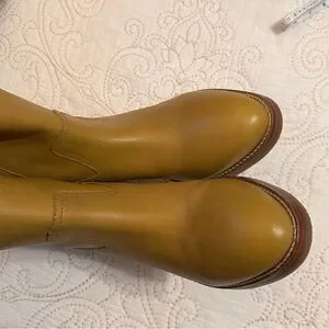 Chic tan yellow leather boots by Frye. Stacked wood chunky heeled design. Pull on. “Camryn tall pull on” similar to the very popular “Campus” style.