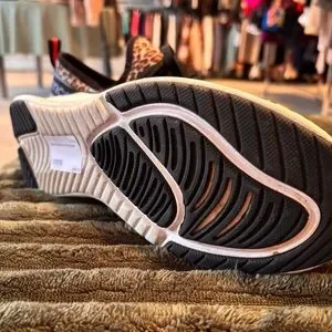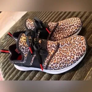 Stylish leopard print sneakers with black accents and white soles. Perfect for casual wear.