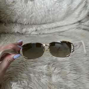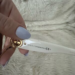This is an authentic pair of GUCCI Crystal GG 2820/F/S Sunglasses in White. These classic sunglasses feature tinted brown lenses. The arms are white with crystal-encrusted GUCCI engravings at the temple.