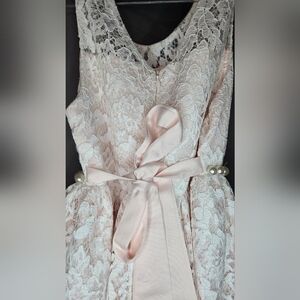 Girl size 7 little pink American Princess lacey dress with a tule underlay. Zipper in the back for a closure. A pearl wrap around the waist and beautiful satin tie in the back.