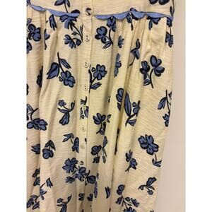 A cream-colored beauty with a playful blue floral print. The adjustable/tie straps and scalloped edge detail add a touch of whimsy to the button-down design. With a charming square neckline and midi length, this dress is perfect for any occasion.