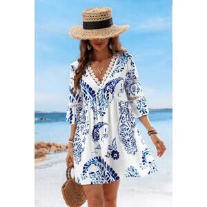 The Cupshe Floral Paisley Print Lace Dress in size XS is a stylish and versatile piece perfect for both party and casual occasions. This V-neck dress features a beautiful paisley pattern in a vibrant multicolor, with 3/4 sleeves and a pullover closure for easy wear. Made from soft rayon material, this short dress is machine washable and designed for regular sizing. With a Sundress style, this adorable dress is ideal for summer, fall, and spring seasons, making it a must-have for any fashion-forward woman's wardrobe.