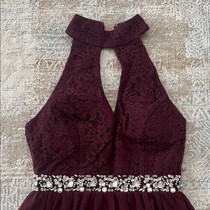 This chic burgundy dress is perfect for formal occasions. The embellished waist adds a touch of sparkle, making it a standout choice.