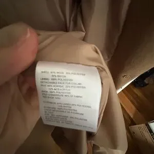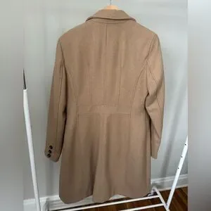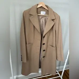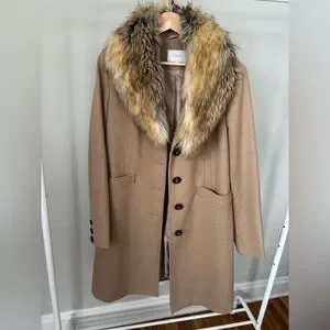 Stylish tan camel wool blend coat with detachable faux fur collar. In good used condition.