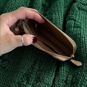 Chic Coach key holder in beige leather. Features a secure zip closure and gold-tone hardware. Ideal for organizing keys and cards.