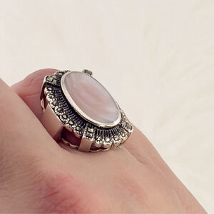 Chunky Vintage Marcasite and Mother of Pearl Ring Size 7 Sterling Silver 925 White Pink. Good condition. No missing stones. Marked 925 NF Thailand. Gorgeous ring. Pictures don’t quite do this ring justice. Beautiful flash of color and shimmer from this stone. Wears very nicely. Thailand rings are usually of better quality, and this one doesn’t disappoint. Amazing estate find.
