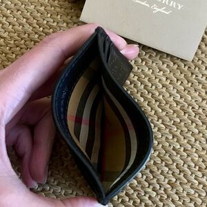 Like New (Used 2x) Burberry Black Perforated Leather Sandon Card Holder—Unisex. Beautiful 100% Leather with Handprinted edges. Includes: Box, Ribbon, Care Card, Tag, Dust Bag. Bought Direct from Burberry.