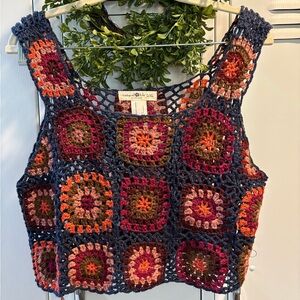 Natural Life Sz XL Loose Fit Patchwork Crochet Crop Tank Top navy multi-color